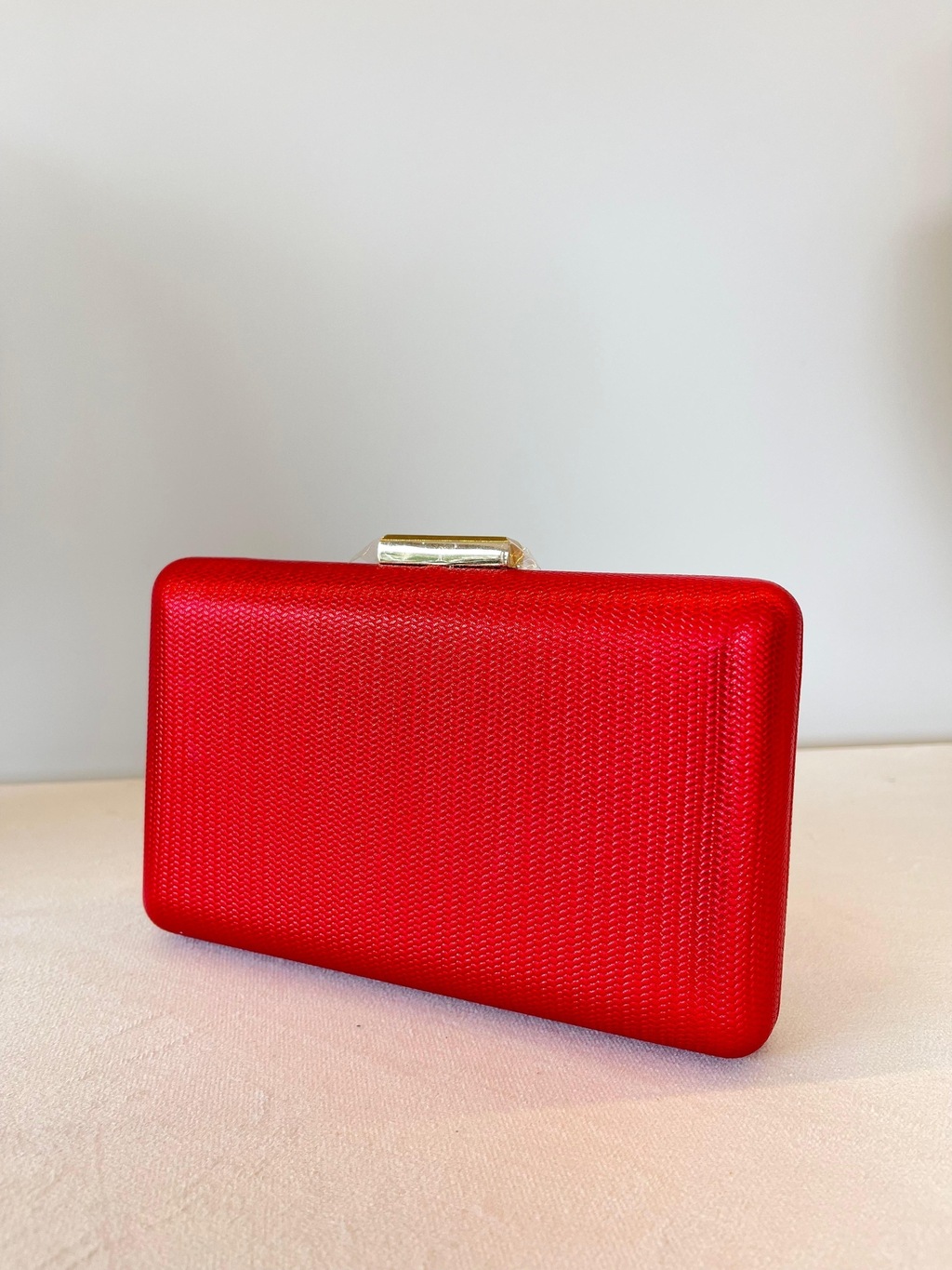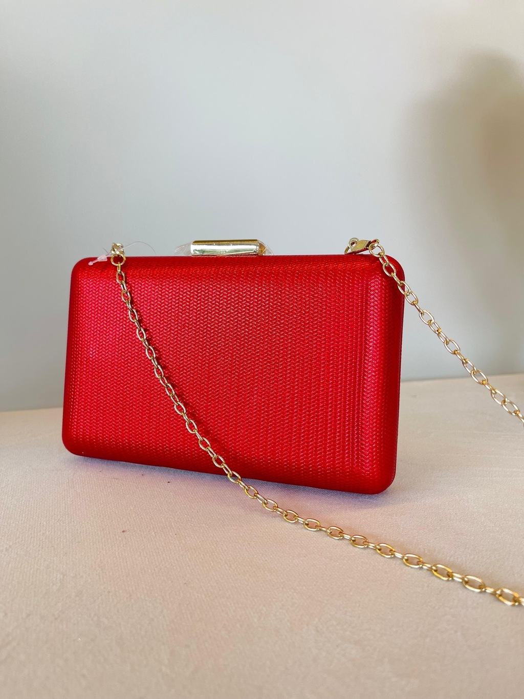 Clutch vermelha lisa, com alça de correntaria dourada.